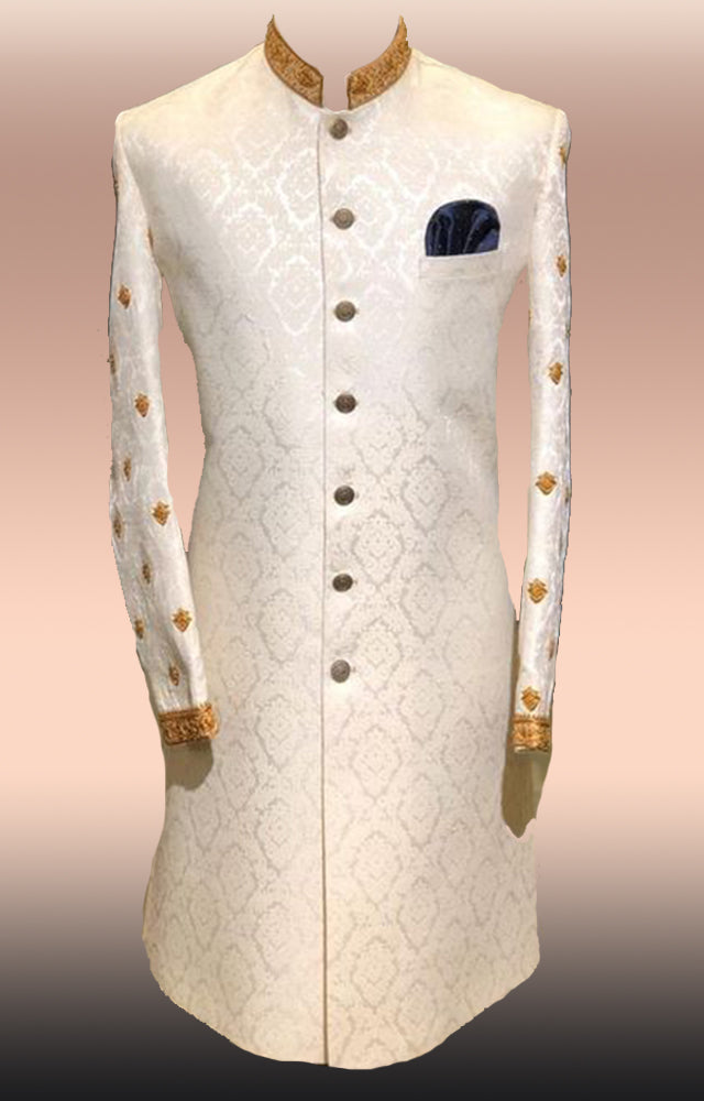 Off White Sherwani with Golden Embroidery that feels complements the sherwani's style and elegance.