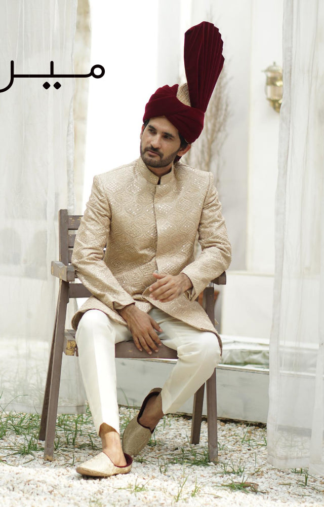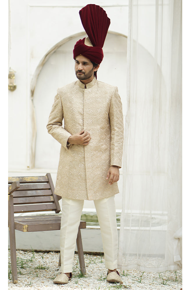Our  classic beautiful MEER sharwani is  most  recommended for groom first  day rose gold  color  gives best  contrast with bridal maroon or red lehnga  shade and  yes  the  malty head embroidery makes your look 100 percent  and  royal.
