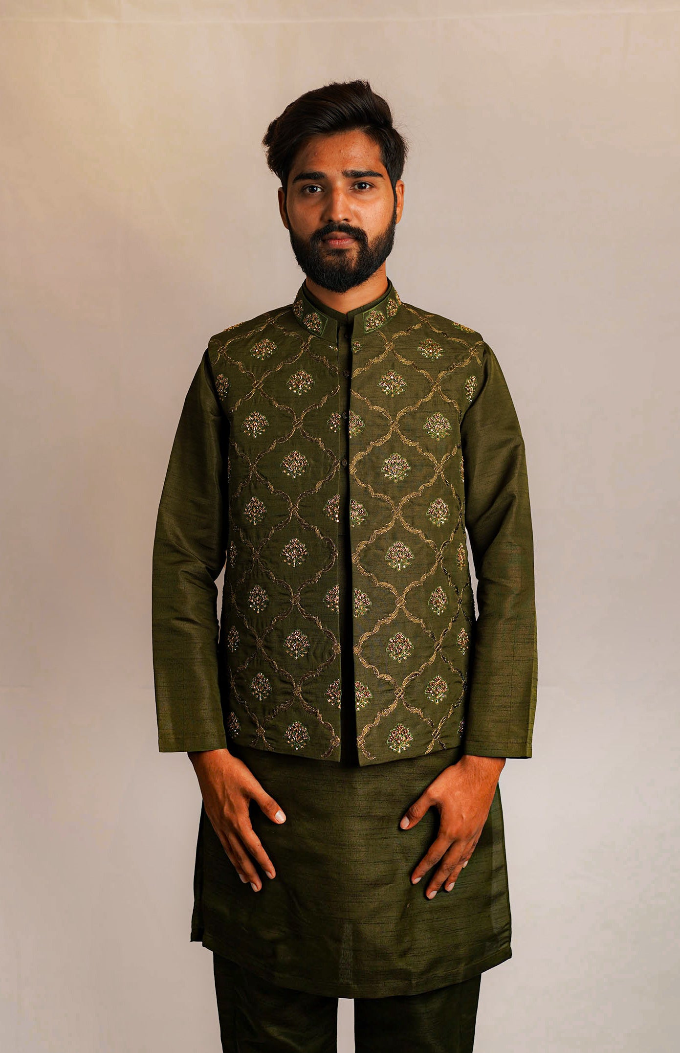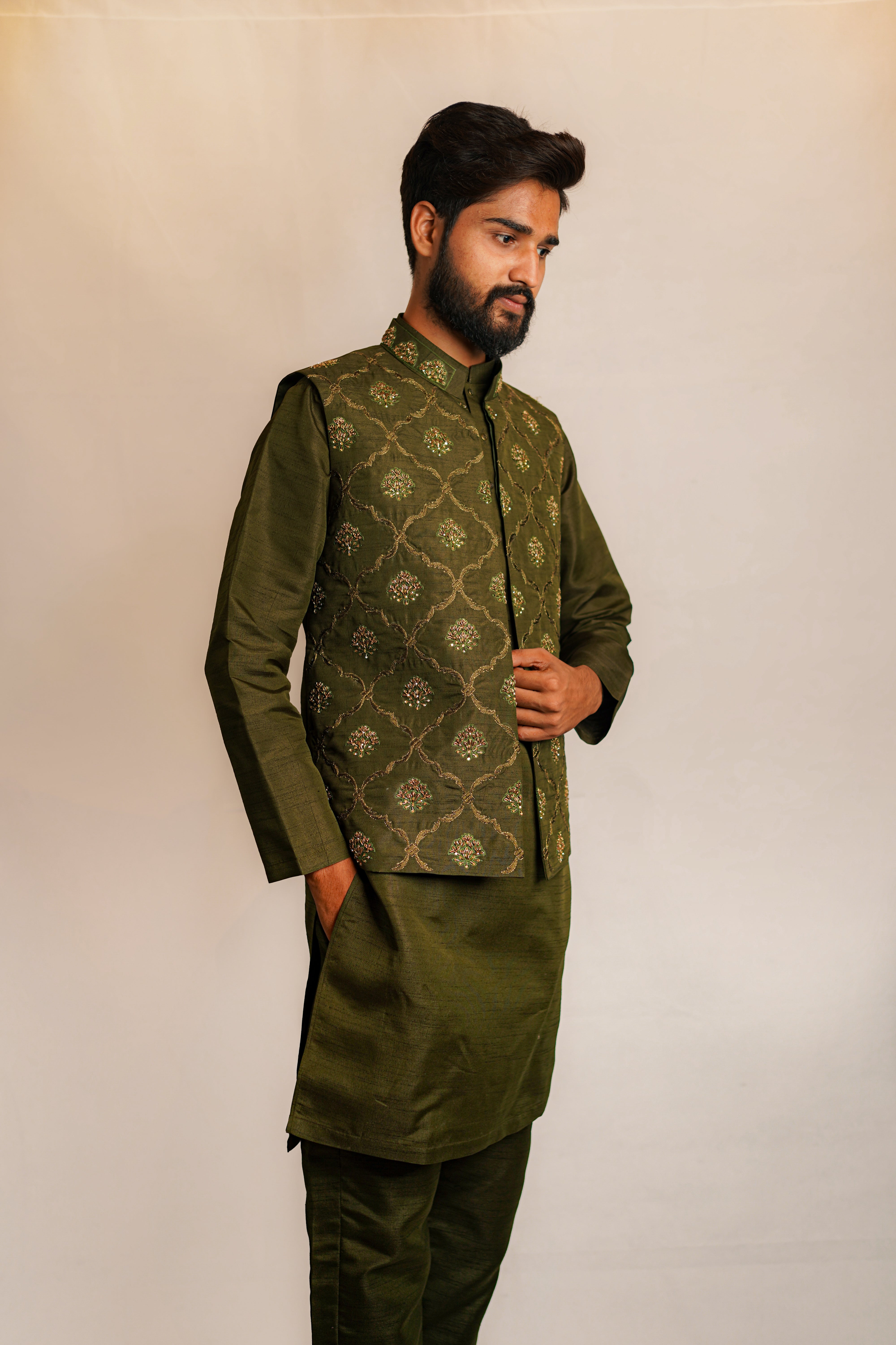 This Men Ameer Waist Coat is crafted from high-quality materials with a classic design that exudes sophistication. Made for comfort and style, it offers a modern and polished look for any occasion. With its impeccable fit and timeless appeal, it is a must-have addition to any gentleman's wardrobe.
