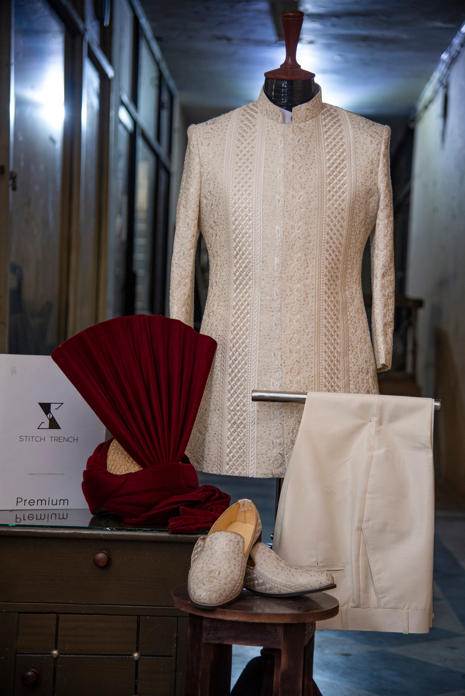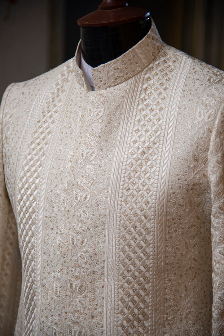 shahmeer sharwani is most beautiful trendy malty head sherwani for first day look .its very classic tinch of cream color sharwani and the use of sikwance work make it omg .dont be skip your best look